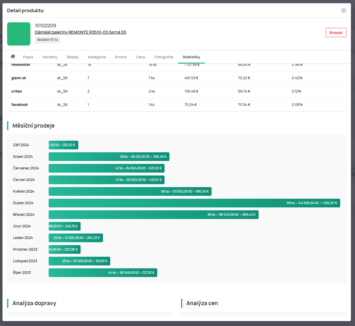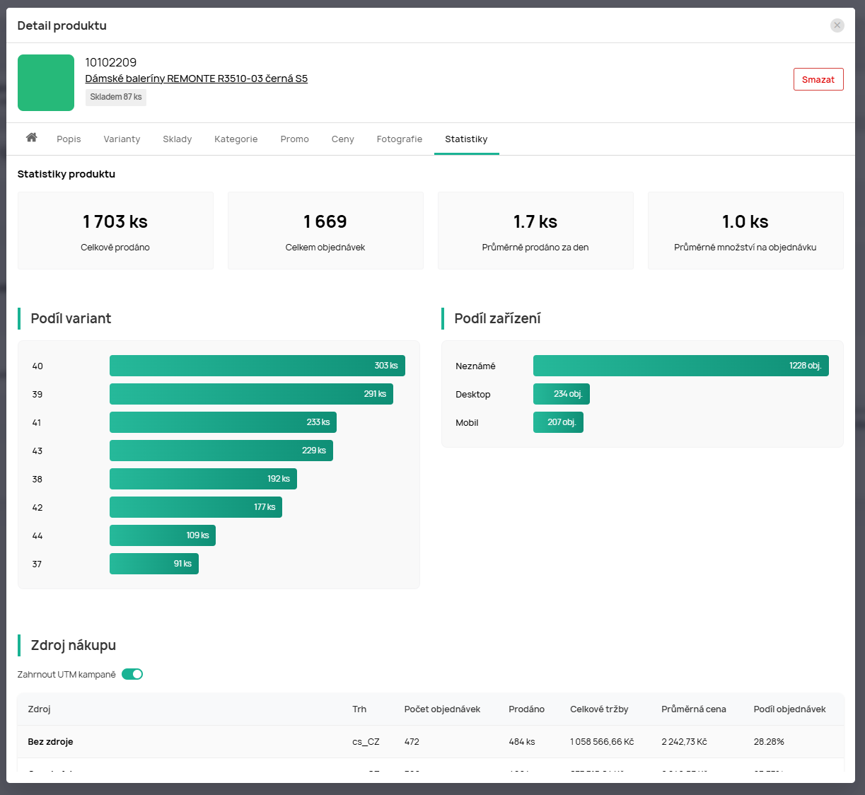 - 🎨 Podíly variant – přehled nejprodávanějších velikostí, barev a dalších variant